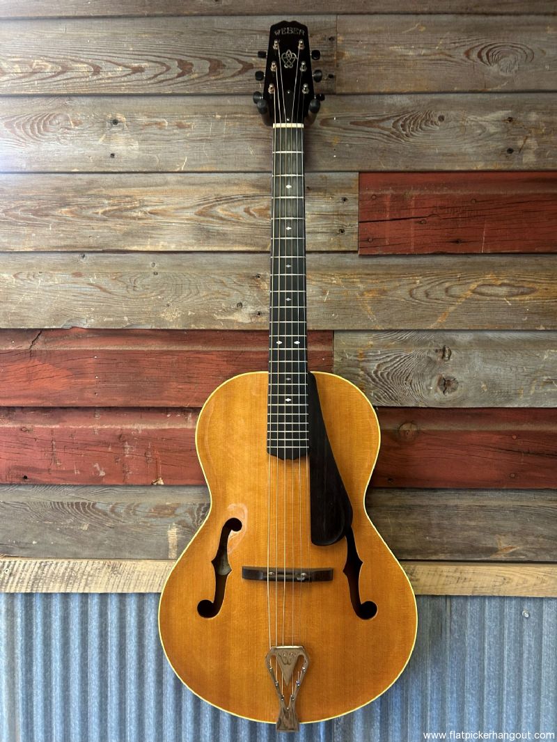 Ebony peghead veneer with the ‘Weber’ logo and Celtic knot pearl inlays. Bound and radiused ebony fingerboard with a 1-3/8” bone nut, 25” scale, diamond shaped pearl fret markers, and .080 frets. Ivory top body binding with an ebony heel cap.